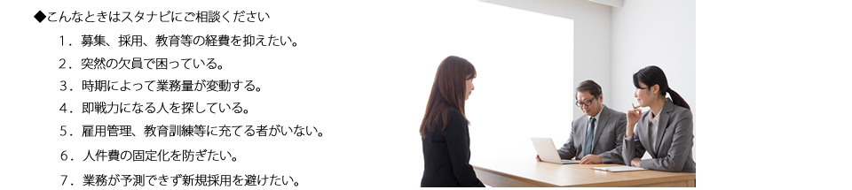 当社、株式会社スタナビは、労働者派遣や有料職業紹介といった、人材に関するサービスを提供しています。 生産の増加、期日のひっ迫、急な欠員、急な増員の必要といった状況の変化で、自社で求人募集から採用、社員教育、労務管理を行うのは大変なことだと思います。そこで、業務量の変化の対応に労働者派遣、紹介などその場面に合った方法をご提案させていただきます。時代は人件費を固定化から変動化に変化しています。いかにコストを削減するかは、企業にとって大きな課題です。そして、これからは雇用形態も状況に合わせた変化が必要です。派遣社員を活用することによって、より柔軟な企業経営を目指してみてはいかがでしょうか。